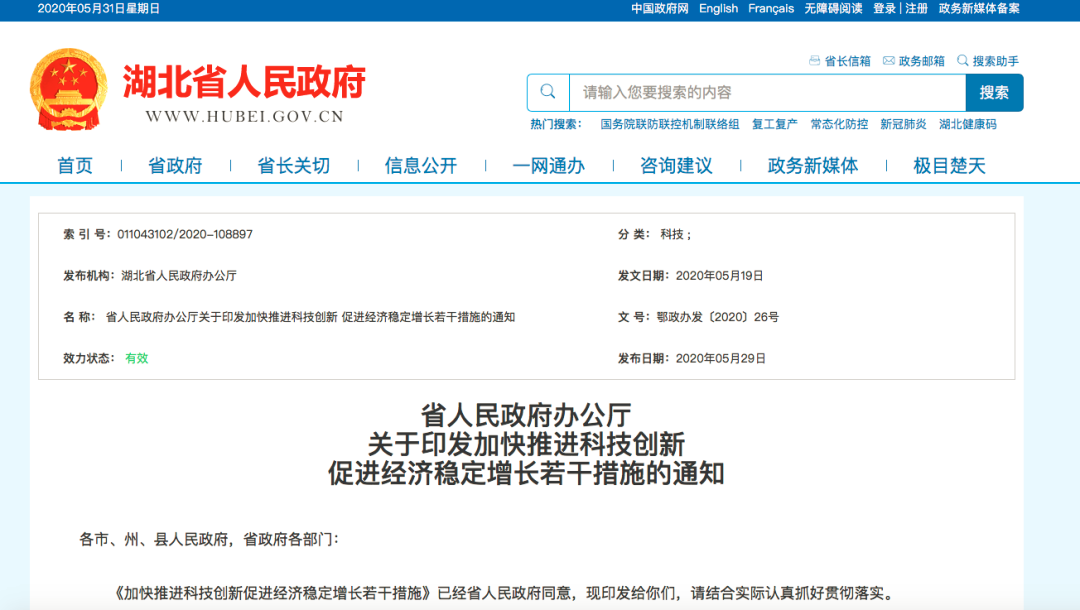 2、湖北省人民政府办公厅关于印发《加快推进科技创新促进经济稳定增长若干措施》的通知