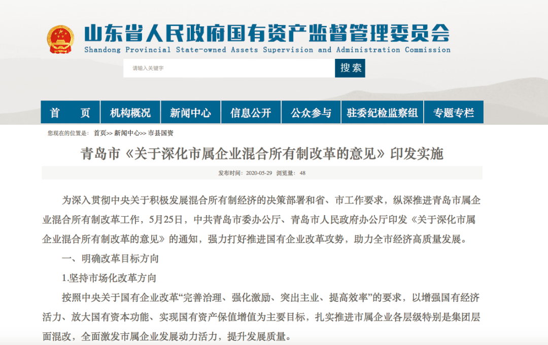 3、中共青岛市委办公厅、青岛市人民政府办公厅印发《关于深化市属企业混合所有制改革的意见》