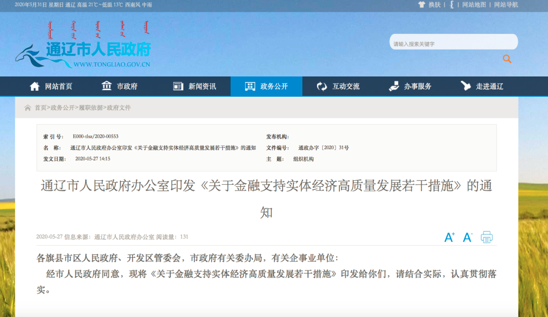4、通辽市人民政府办公室印发《关于金融支持实体经济高质量发展若干措施》的通知