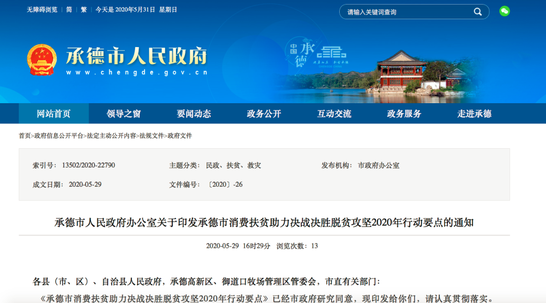 5、承德市人民政府办公室关于印发《承德市消费扶贫助力决战决胜脱贫攻坚2020年行动要点》的通知 |
