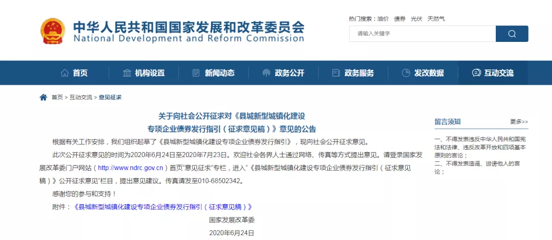 1、国家发改委关于向社会公开征求对《县城新型城镇化建设专项企业债券发行指引(征求意见稿)》意见的公告