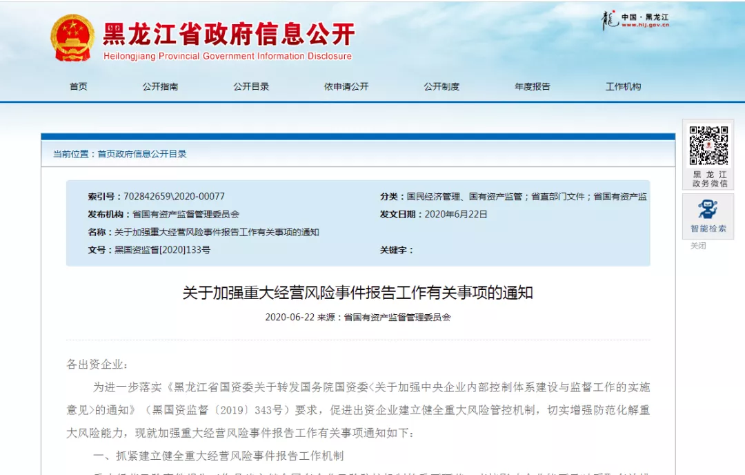 黑龙江省为进一步落实《黑龙江省国资委关于转发国务院国资委<关于加强中央企业内部控制体系建设与监督工作的实施意见>的通知》(黑国资监督〔2019〕343号)要求,促进出资企业建立健全重大风险管控机制,切实增强防范化解重大风险能力,出台了本《通知》,进一步明确了重大经营风险事件报告工作机制、重大经营风险事件报告范围、重大经营风险事件报告程序、重大经营风险事件续报要求等方面工作。