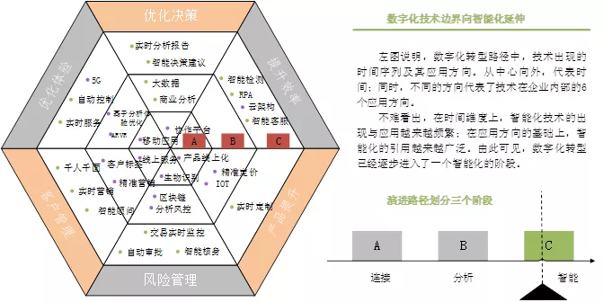 第三阶段是目前许多市场化行业龙头企业正在努力推进的数字化最新阶段——数字化智能化阶段,对内表现为智能决策、实时分析报告、交易实时监控、自动审批等经营管理手段,对外则表现为实时服务、智能客服、实时营销、智能顾问等智能化服务。