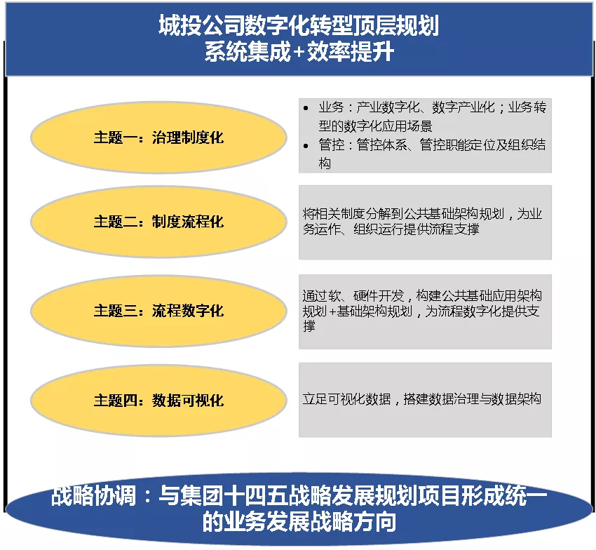 要以系统集成与效率为导向,围绕四大战略主题—治理制度化、制度流程化、流程数字化、数字可视化,在与集团十四五战略发展规划项目形成统一的业务发展战略方向的基础上,谋划可持续发展之路。