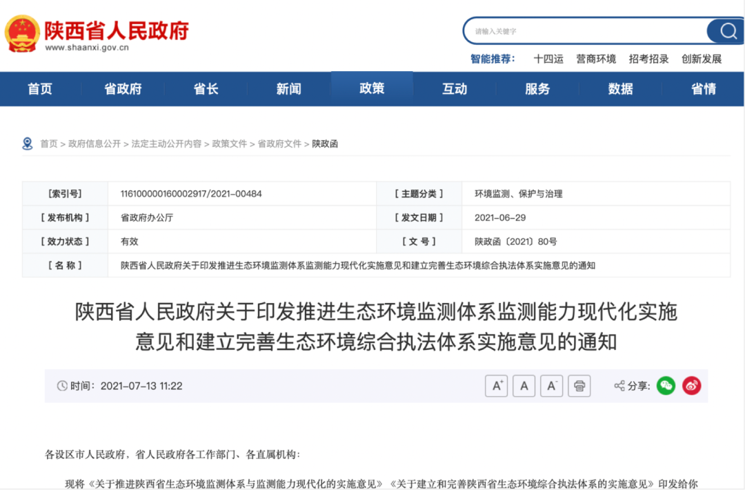 6、陕西省人民政府关于印发推进生态环境监测体系监测能力现代化实施意见和建立完善生态环境综合执法体系实施意见的通知