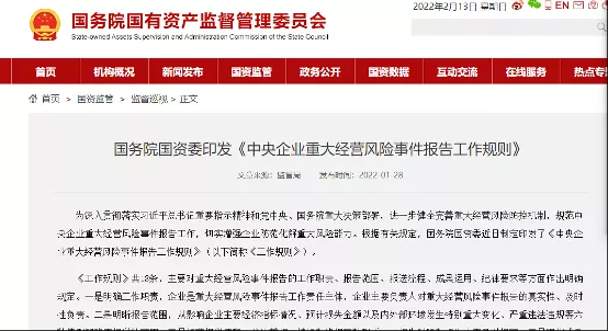 1、国务院国资委印发《中央企业重大经营风险事件报告工作规则》