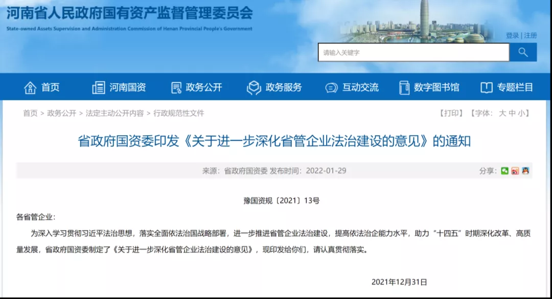 2、省政府国资委印发《关于进一步深化省管企业法治建设的意见》的通知
