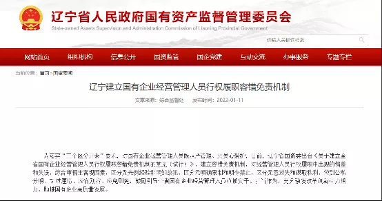 3、辽宁省国资委出台《关于建立全省国有企业经营管理人员行权履职容错免责机制的意见(试行)》