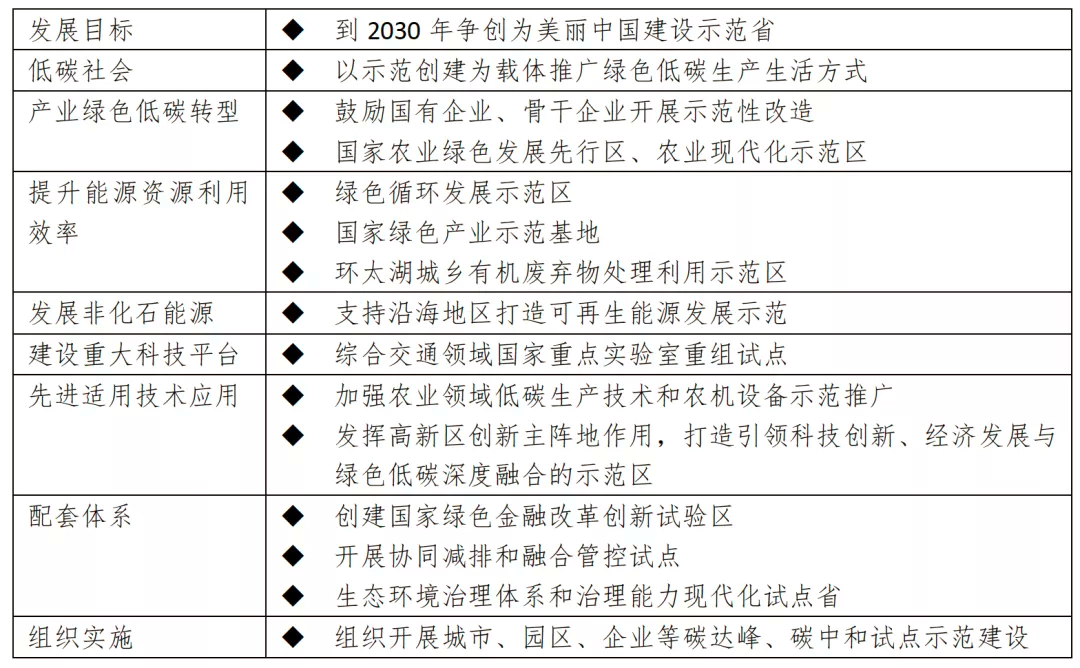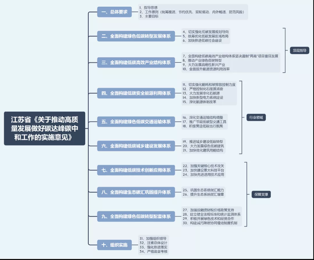在江苏《实施意见》的第二部分至第九部分,以“低碳”为核心提出构建“八大体系”,大致可分为顶层指导、产业领域、保障支撑三个部分。