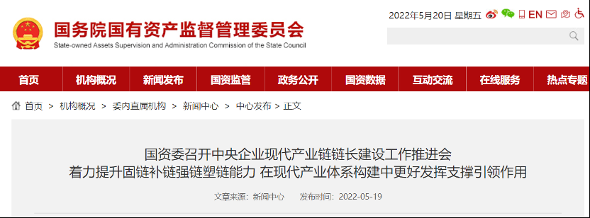 5月19日,国资委以视频和现场相结合的形式召开中央企业现代产业链链长建设工作推进会,深入学习贯彻习近平总书记关于维护产业链供应链安全稳定、构建现代产业体系,特别是中央企业等国有企业要勇当现代产业链链长的重要指示,总结链长建设成效,部署下阶段重点工作,推动中央企业链长建设提质深化。