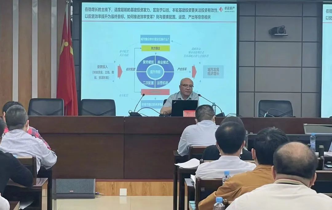 培训会议上,南京卓远总经理吴健首先作《城市视角下的要素配置及产出变革》主题培训,他表示,平台转型是个老话题,卓远公司在近期实操的案例过程中总结应用,认为城市国企处于城市战略中的核心地位,其转型发展不仅与上层建筑城市资源要素、平台政策等的支持力度有关,也受到配置、聚集赋能、整合再配置、企业运营管理等经济活动的效能水平的影响。所以,转型的前提,要追本溯源,厘清本质问题。