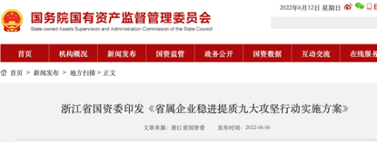 3、浙江省国资委印发《省属企业稳进提质九大攻坚行动实施方案》