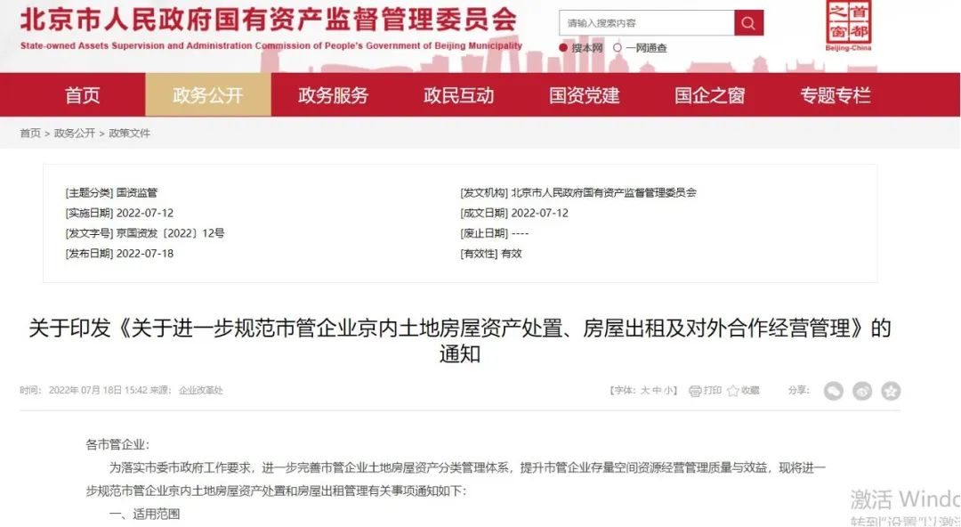1、北京市国资发布《<关于进一步规范市管企业京内土地房屋资产处置、房屋出租及对外合作经营管理>的通知》