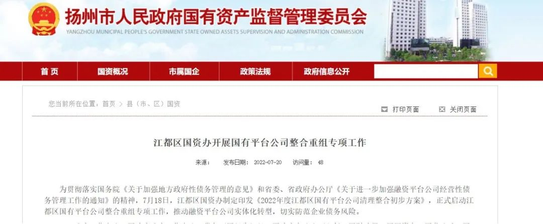 2、扬州市国资委发布《2022年度江都区国有平台公司清理整合初步方案》