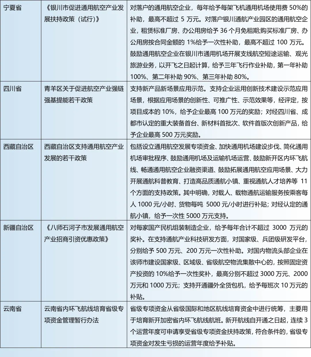 近年来,中央和各地陆续出台政策支持通用航空和低空经济的快速发展,比如海南、湖南、江苏省提出为通用航空机场的建设、运营提供资金补贴;宁夏、广东省对落户本地的产业项目和重要企业给予资金补助和奖励,支持产业链的发展;黑龙江、江西等地号召购买本地企业生产的通航设备和服务,支持当地通航产业做大做强。