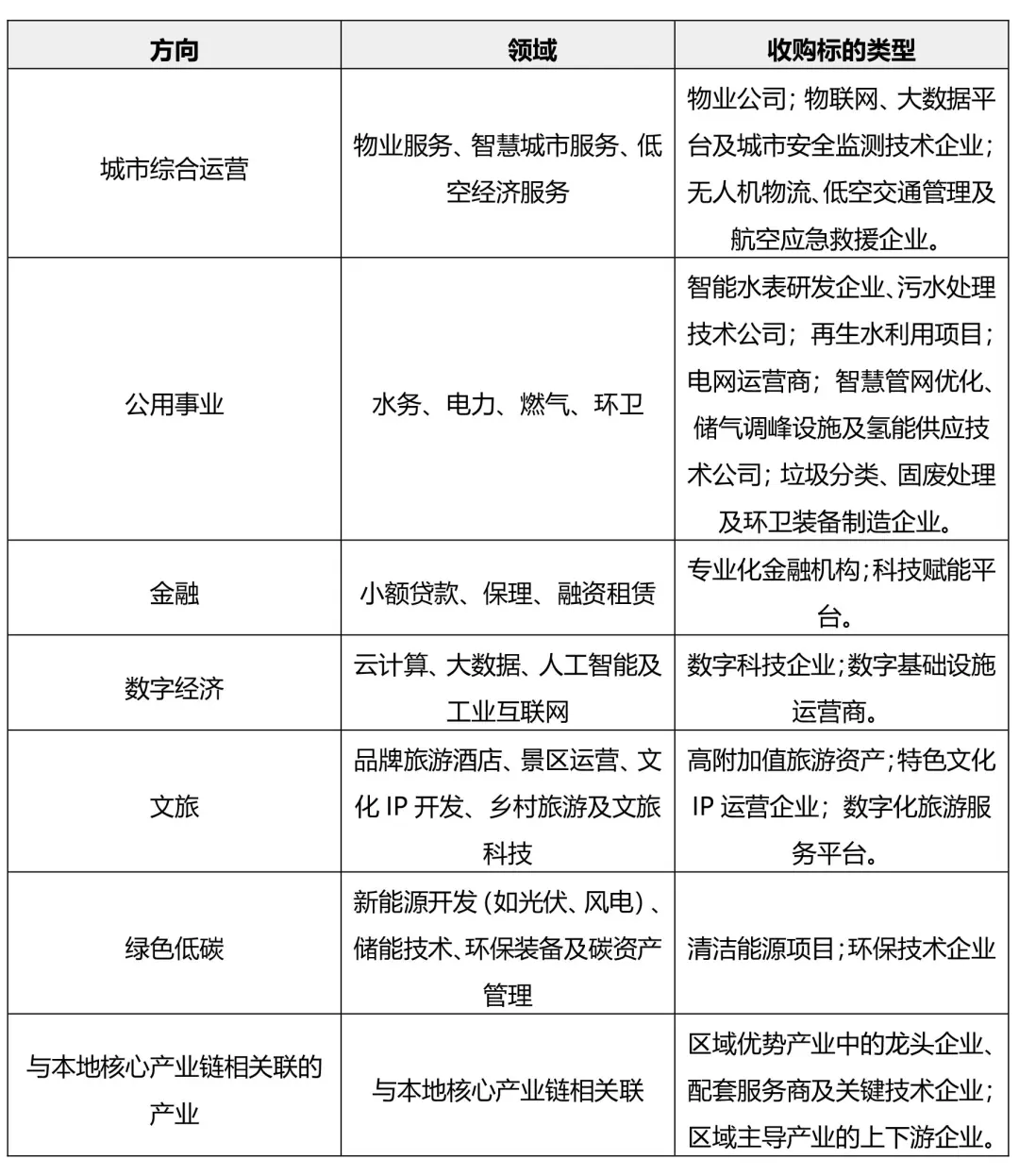 国企平台公司产业化收购围绕“服务城市升级、赋能实体经济、响应国家战略”三大核心逻辑展开,聚焦公共服务提质、数字技术赋能、绿色低碳转型及区域经济协同等关键领域,涵盖城市综合运营、公用事业、金融、数字经济、文旅、绿色低碳、与本地核心产业链相关联的产业等方向,具体如下表所示: