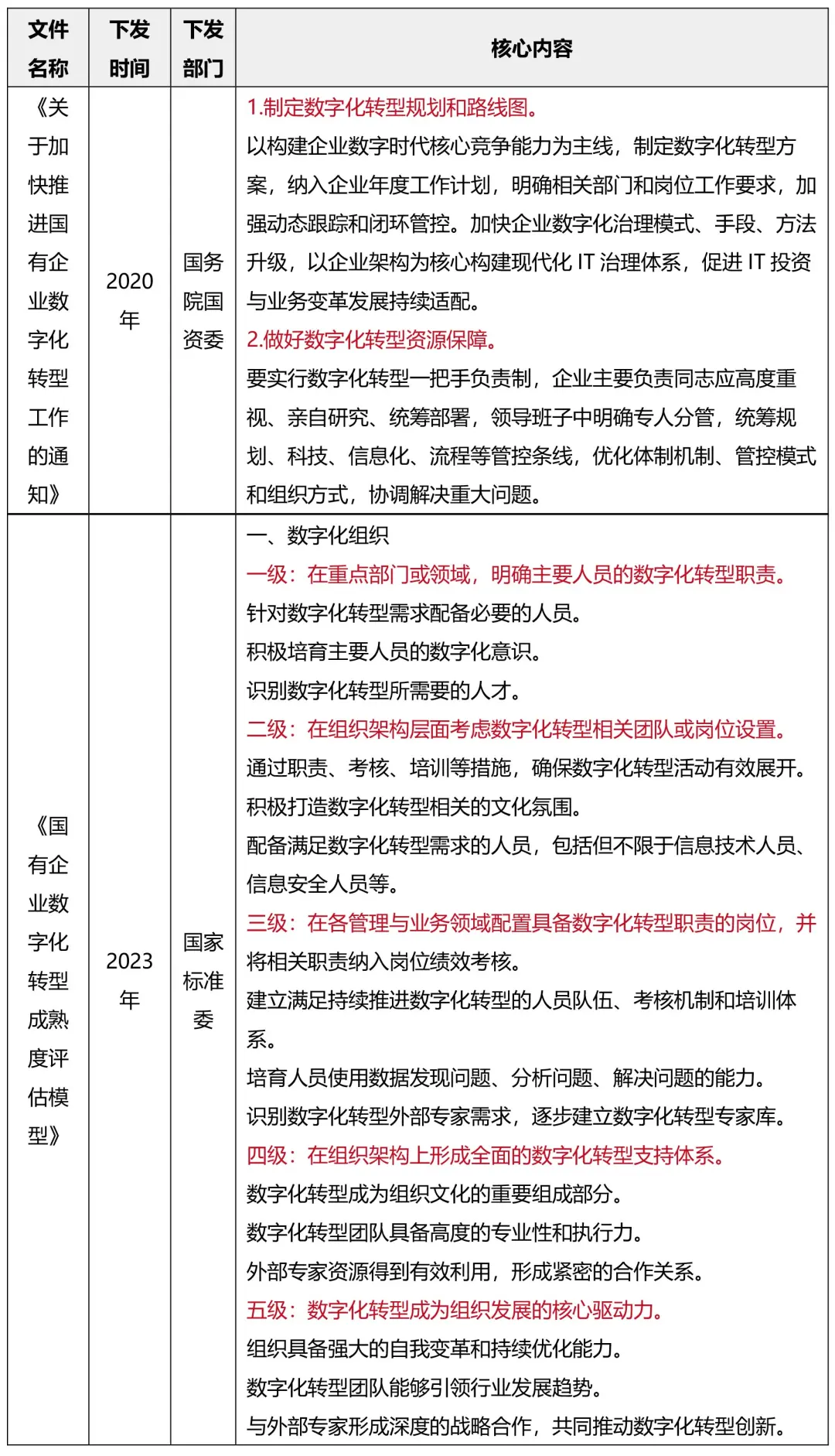 2020年国资委发布的《关于加快推进国有企业数字化转型工作的通知》提出,以构建企业数字时代核心竞争能力为主线,明确规划和执行路径,强化执行保障,推进国有企业数字化转型。在《国有企业数字化转型成熟度评估模型》中,将组织作为评估的重要维度之一,评估模型通过对组织管理的关键要素进行系统性分析,帮助企业识别自身在组织架构、文化建设和人才管理等方面的现状与差距。