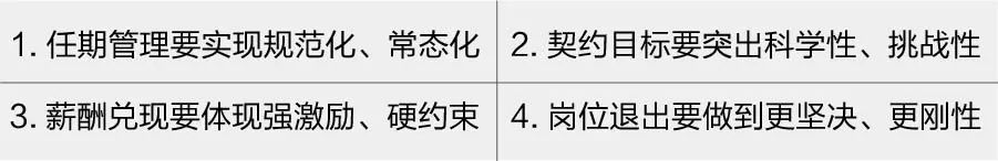 规范化、常态化的任期管理与任期期限的明确,岗位聘任协议的严格履行等密切相关;考核刚性兑现作为重中之重,建立在科学且富有挑战的契约目标之上;为强化精准考核,体现有效激励,薪酬兑现则必须体现强激励、硬约束;通过刚性考核,推动经理层成员职务调整,有效实现“能上能下”。