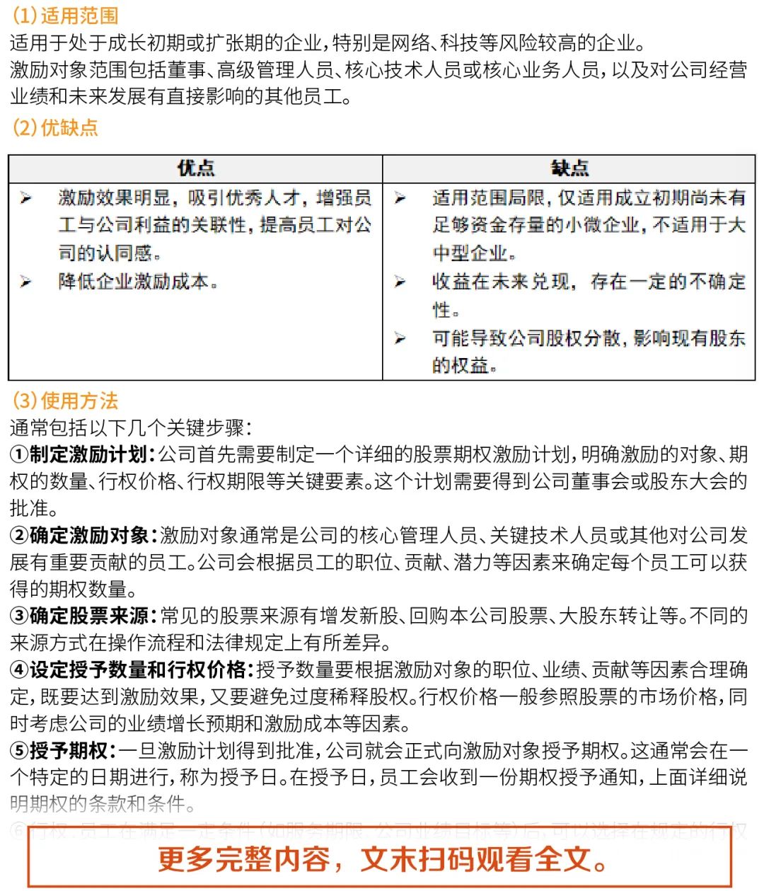 综合类模式是指企业为了激发员工的积极性、创造力和忠诚度,采取的一系列多元化的中长期激励组合手段。综合类激励措施的目的是通过满足员工的不同需求和动机,建立起员工与企业之间的长期利益共享关系,从而促进企业的整体发展和竞争力提升。综合类模式无固定适用企业,但一般而言,更建议处于成熟期阶段的企业采用综合类模式。同样,该模式不仅适用于高层管理人员,也适用于核心技术人员、销售人员以及其他关键岗位的员工。因综合类为上述工具的组合,故此处不再赘述优缺点及使用方法。