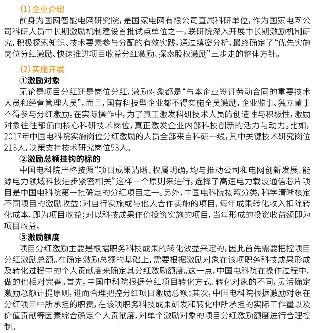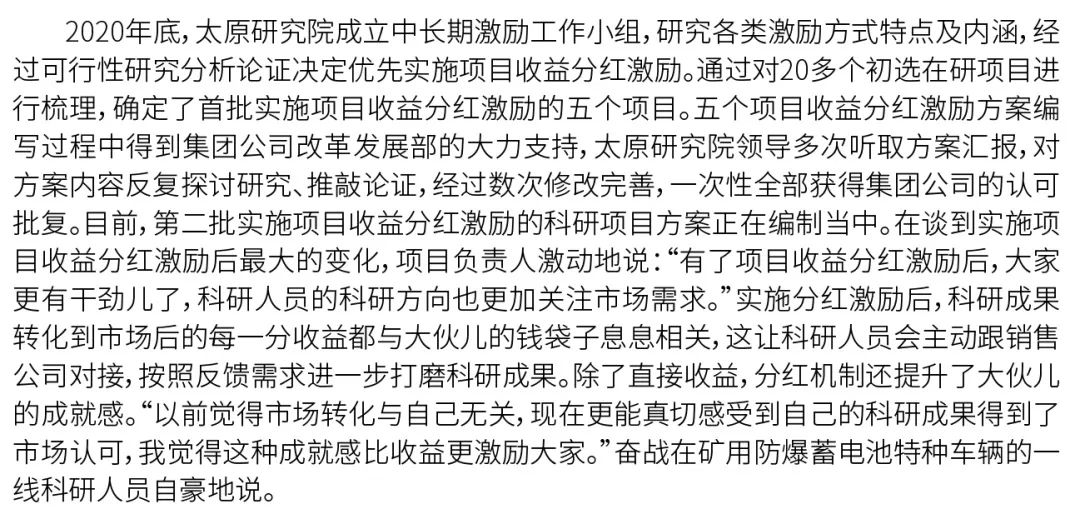 项目收益分红作为中长期期激励的一种,其激励作用相对于其他激励方式,短时间内即可显现,实施方式主要以项目为主体,用于激励项目相关的关键人员,科研项目收益分红是“以科技成果转化收益为标的,采取项目收益分红方式”。激励对象针对性强。项目收益分红的激励来源是项目的增量收益,因此国有资产流失风险小。但是科技成果是企业内部共享的科研产出,其净收入的计算方式是难点,分配比例等不易敲定,实施难度稍大,部分项目收益所需时间周期长,具有不确定性,不利于激励方案设计基础较为薄弱的企业。