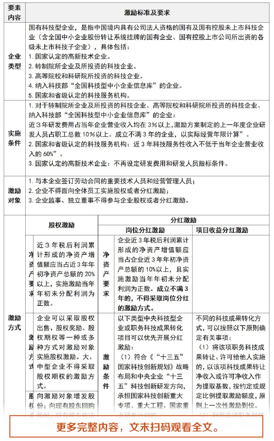 国有科技型企业股权和分红激励主要以《国有科技型企业股权和分红激励暂行办法》(财资〔2016〕4号)为实施依据。另外,《中央科技型企业实施分红激励工作的通知》(国资厅发考分〔2017〕47号)在其基础上对科技型企业采用分红激励方式的工作提供详细实施指导;《关于扩大国有科技型企业股权和分红激励暂行办法实施范围等有关事项的通知》(财资〔2018〕54号) 将国有科技型中小企业、国有控股上市公司所出资的各级未上市科技子企业、转制院所企业投资的科技企业纳入激励实施范围,并对于国家认定的高新技术企业不再设定研发费用和研发人员指标条件,为更多的国有科技型企业实施激励创造了有利条件,详见附件二。